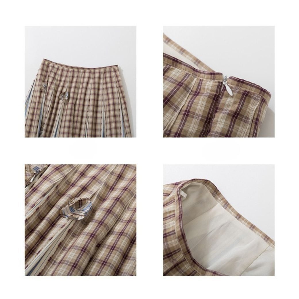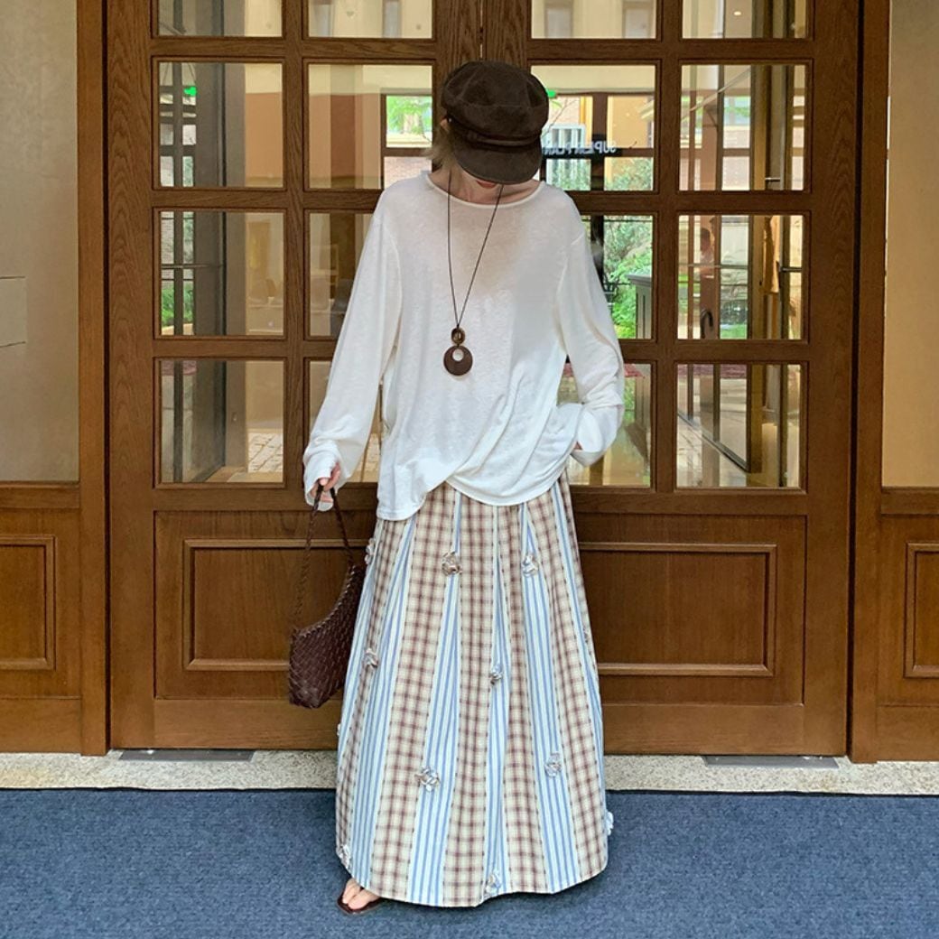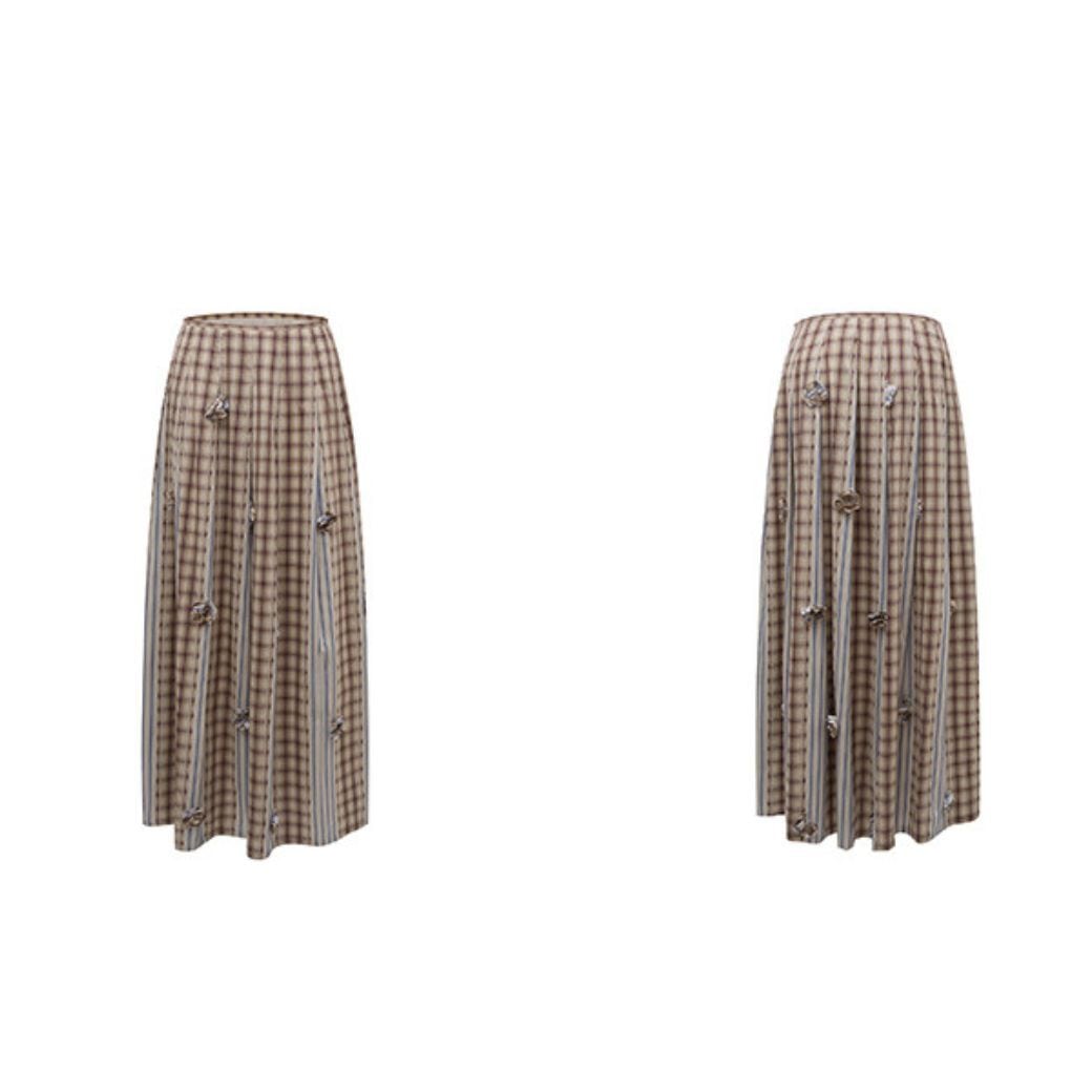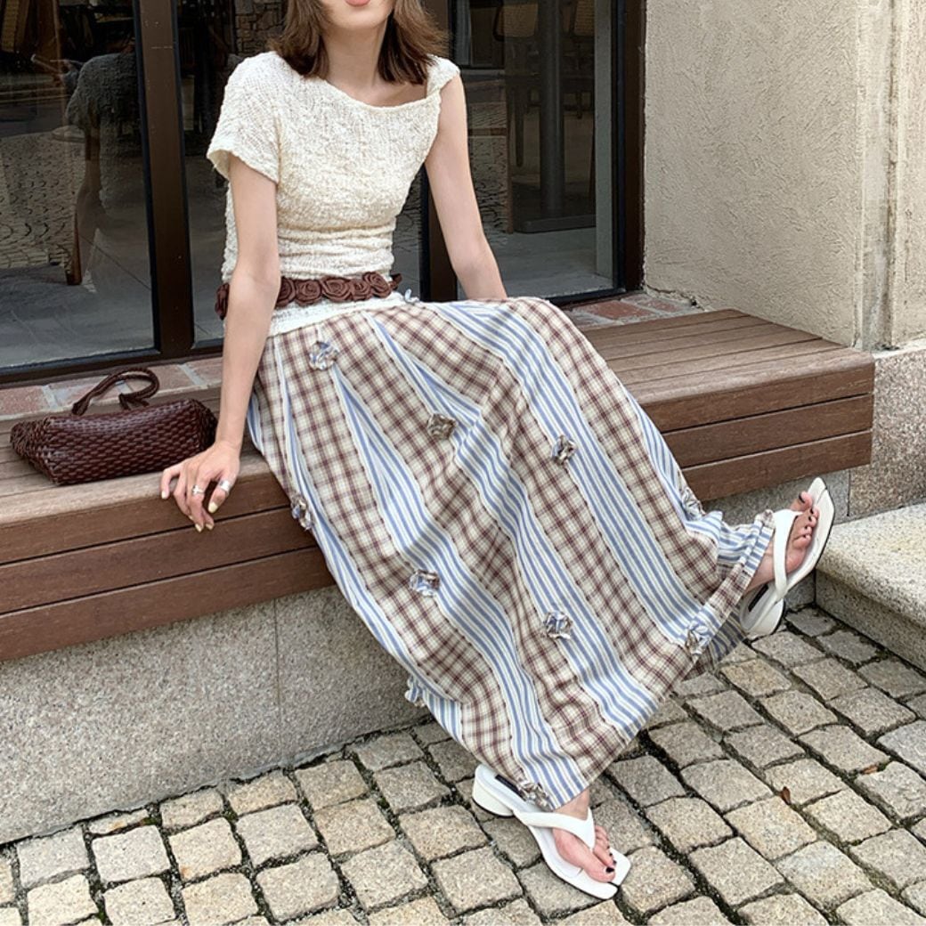 チェックとストライプを大胆に切り替えた、フレアスカート。