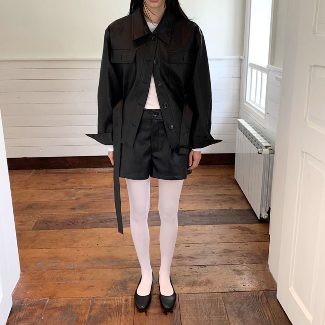 フェイクレザーのジャケットとショートパンツのセットアップ*