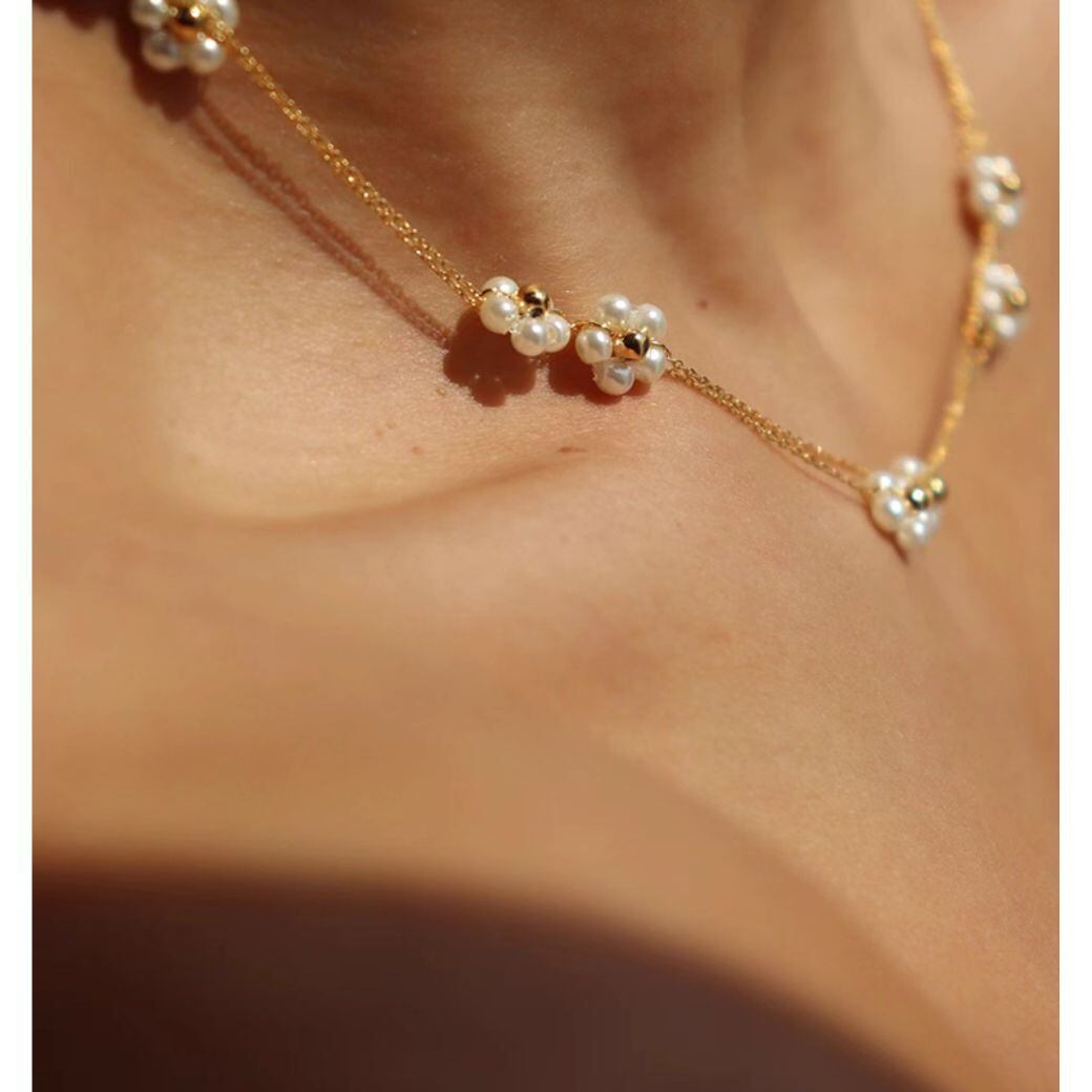 華奢なゴールドチェーンに、パールのフラワーモチーフをあしらったネックレス。