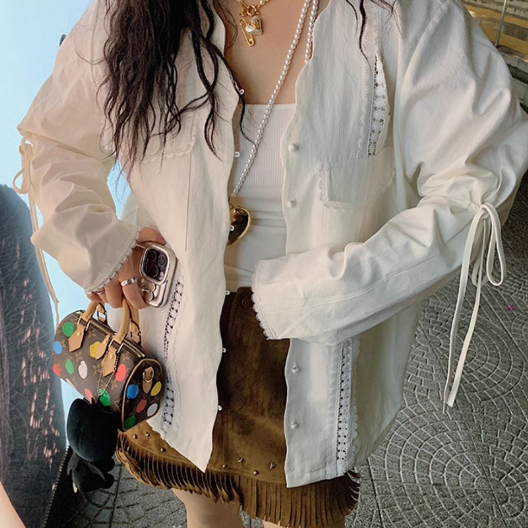 袖のシャーリングやフロントのレースデザインが、さりげなく可愛らしさをプラス。