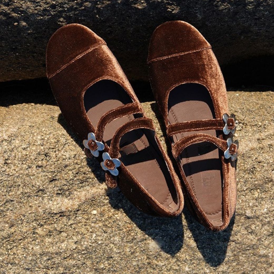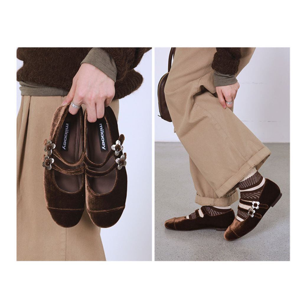 ブラウンのベロア素材で、足元にやわらかな光沢感を...*
