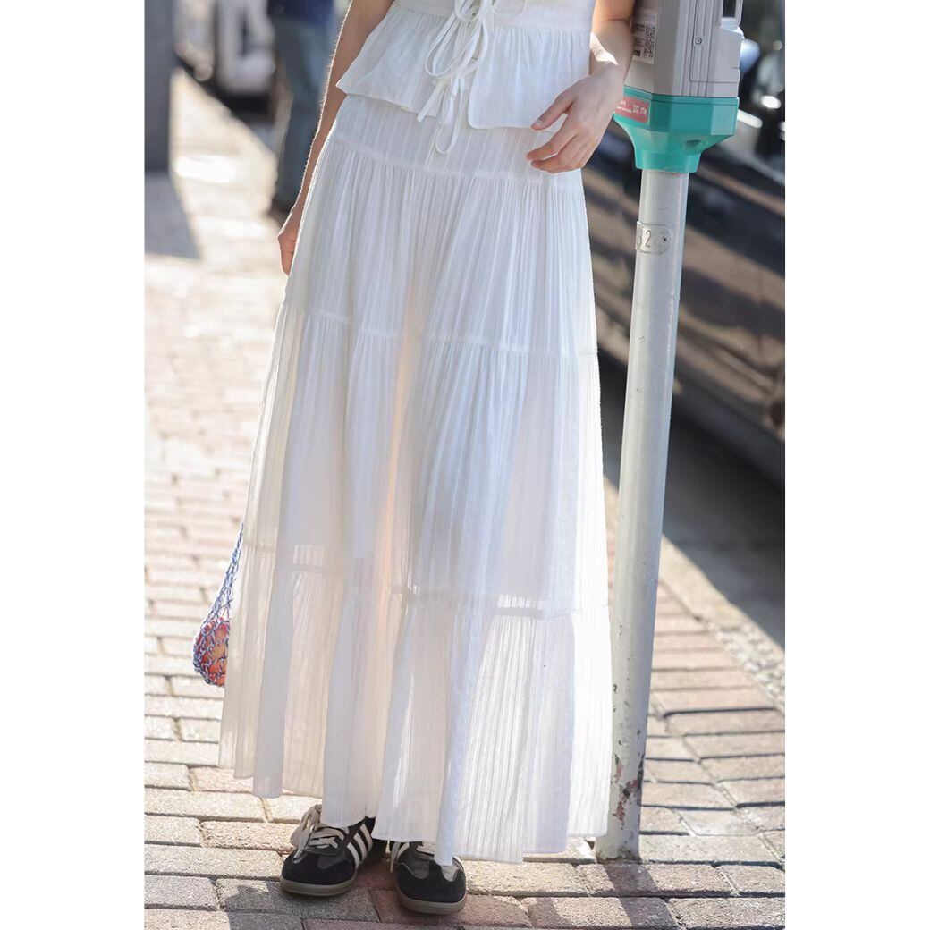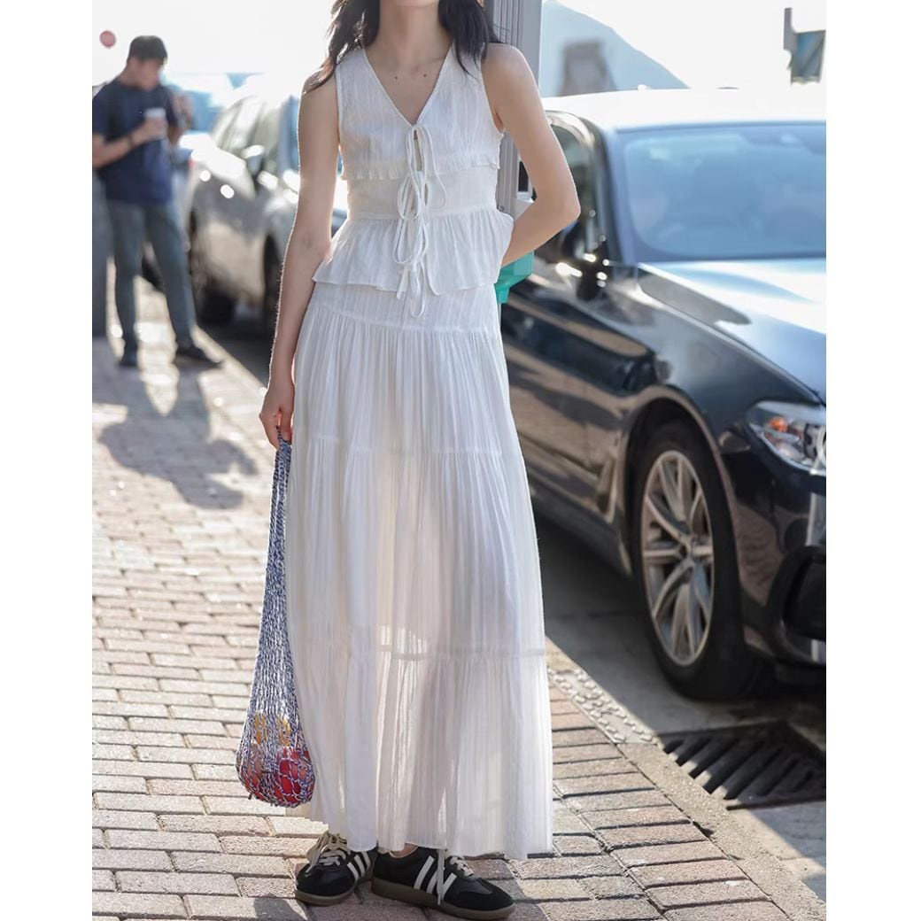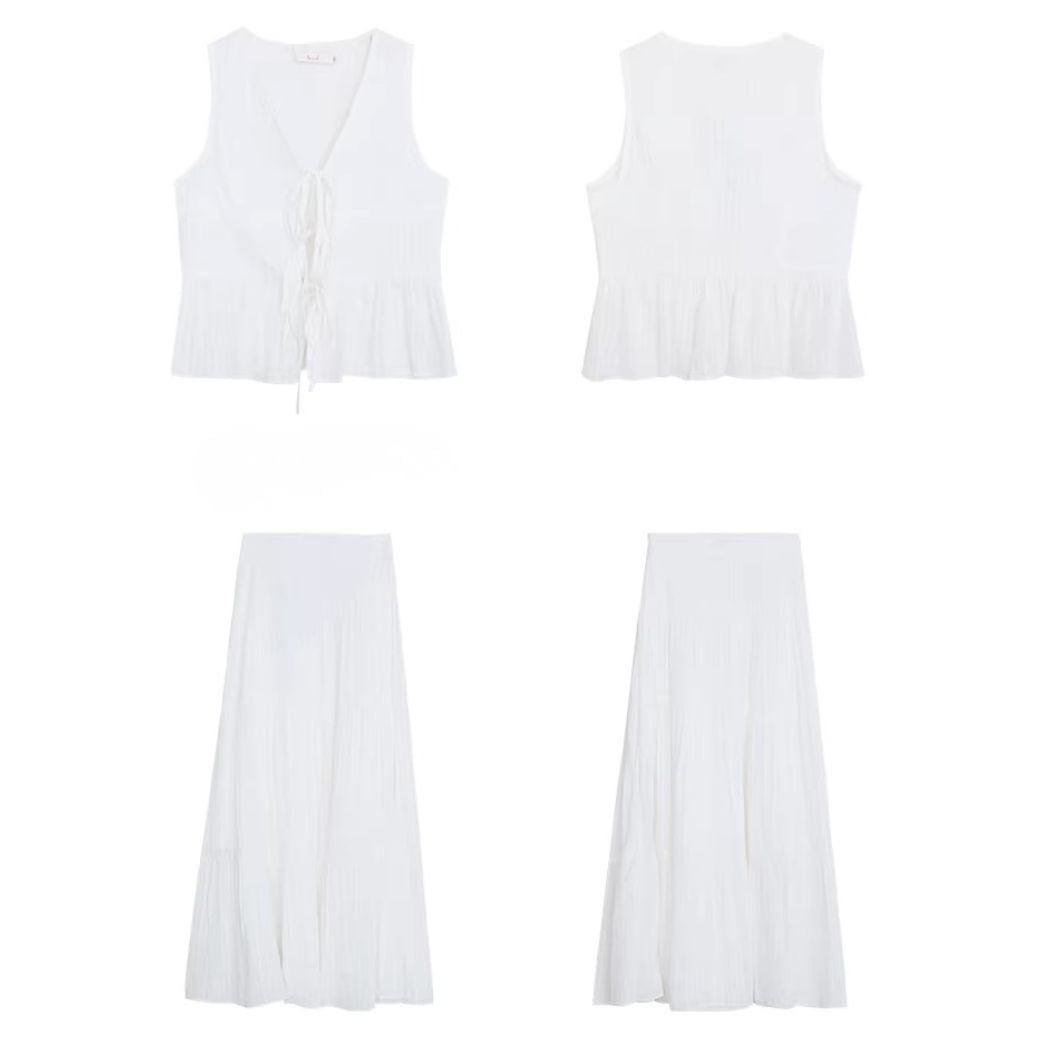 軽やかなプリーツが全体に施された、ホワイトカラーのセットアップ。