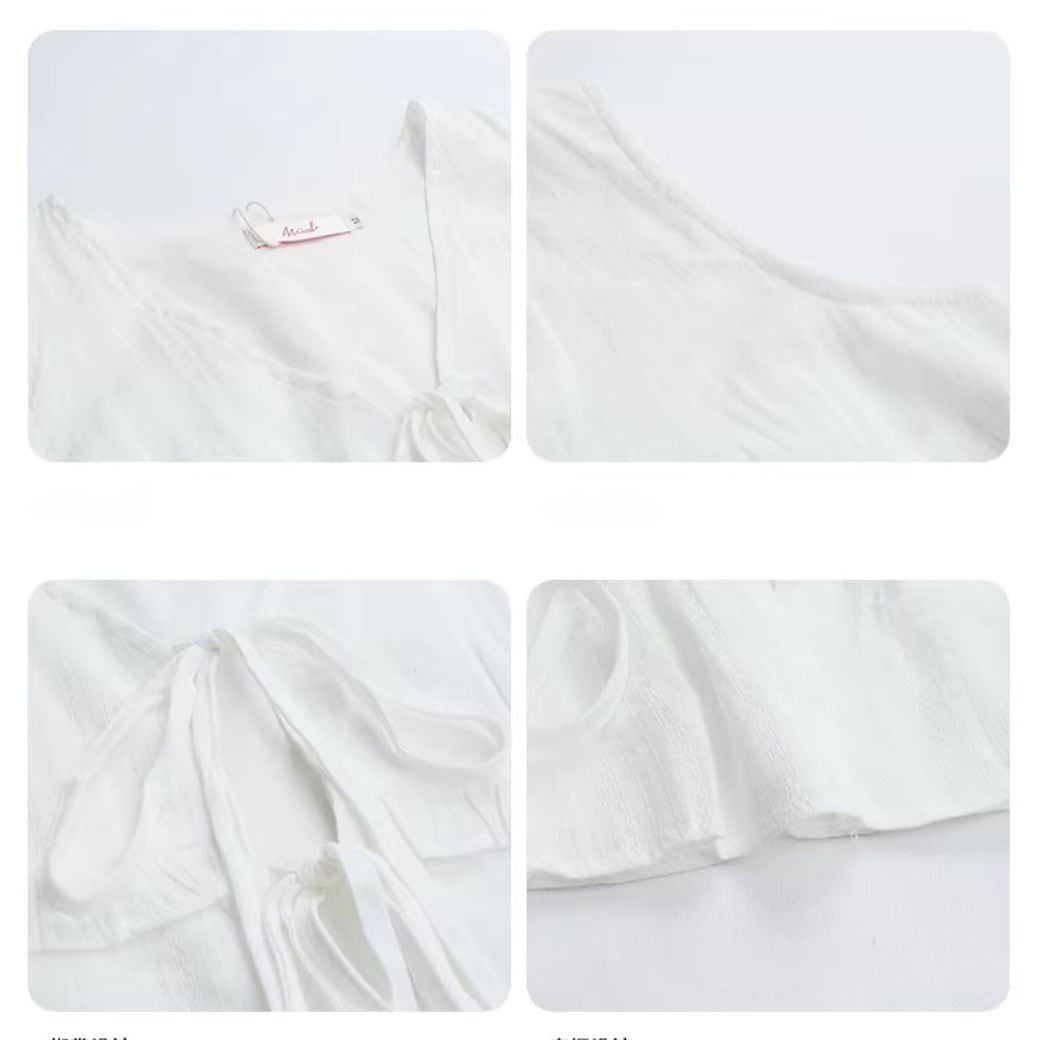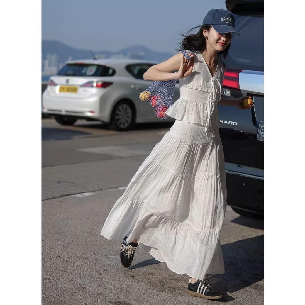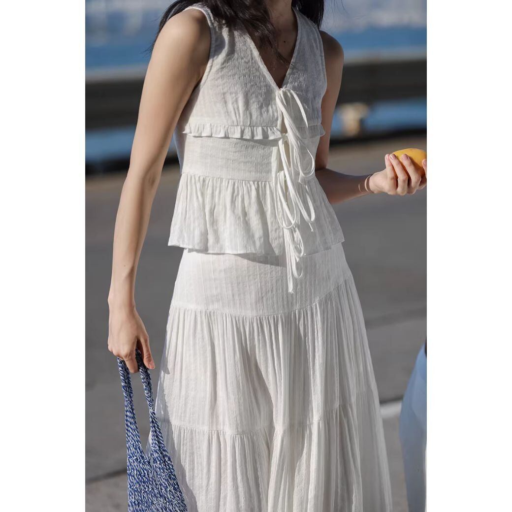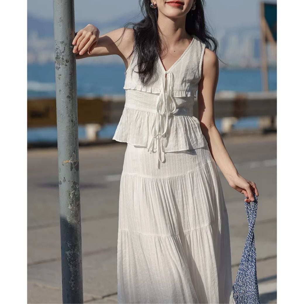 軽やかなプリーツが全体に施された、ホワイトカラーのセットアップ。